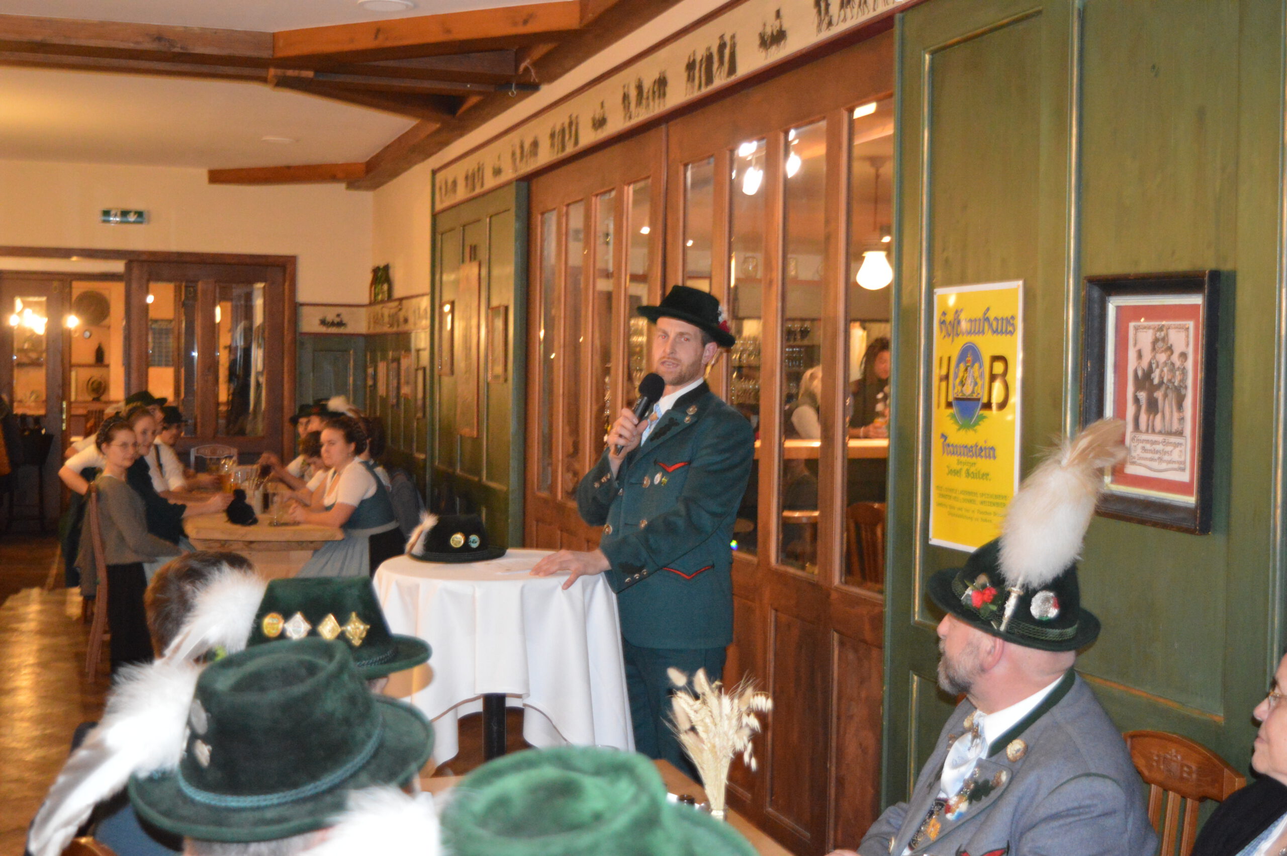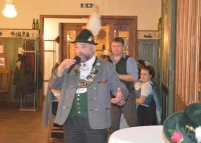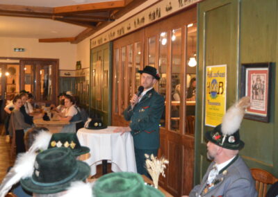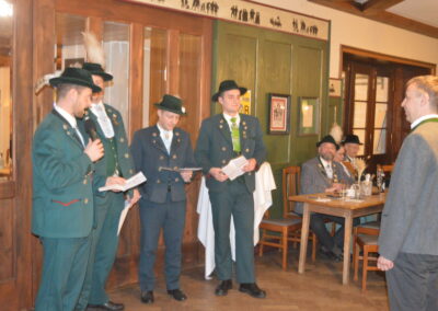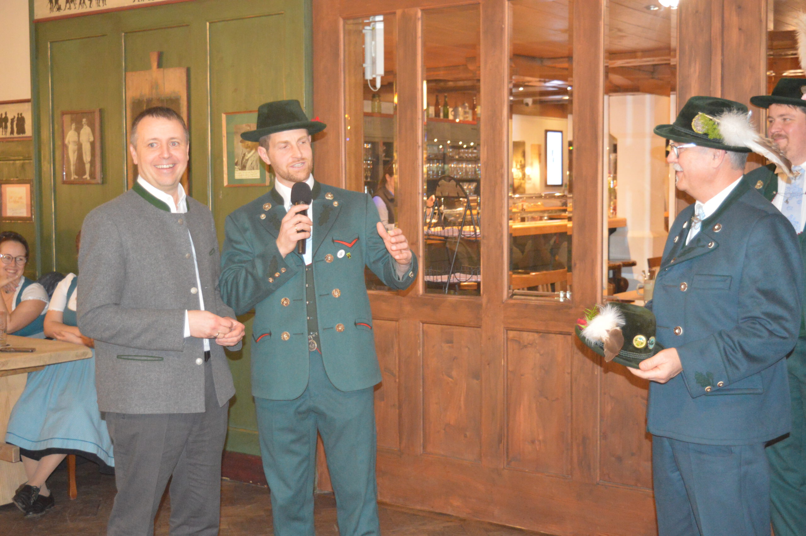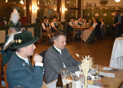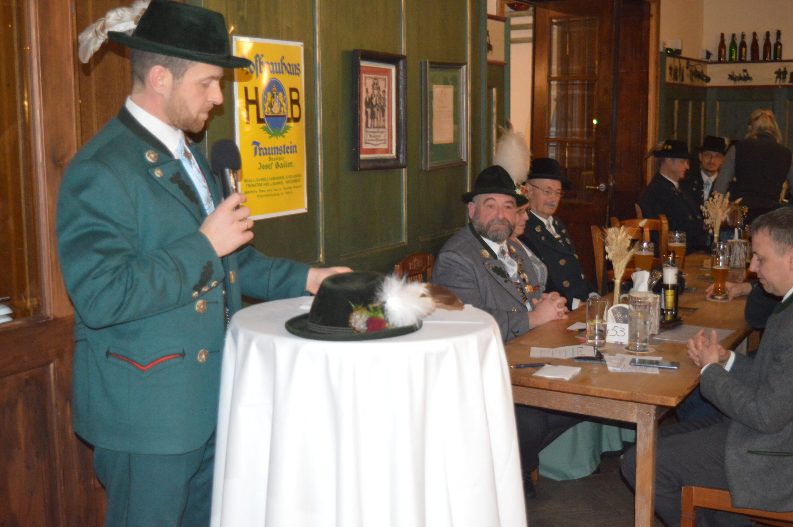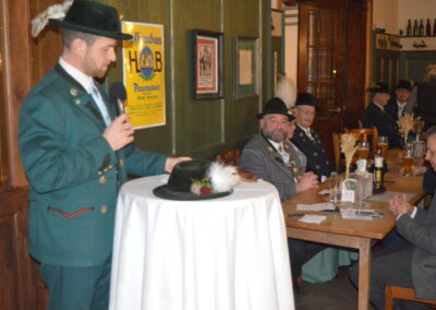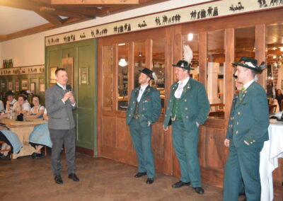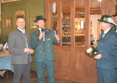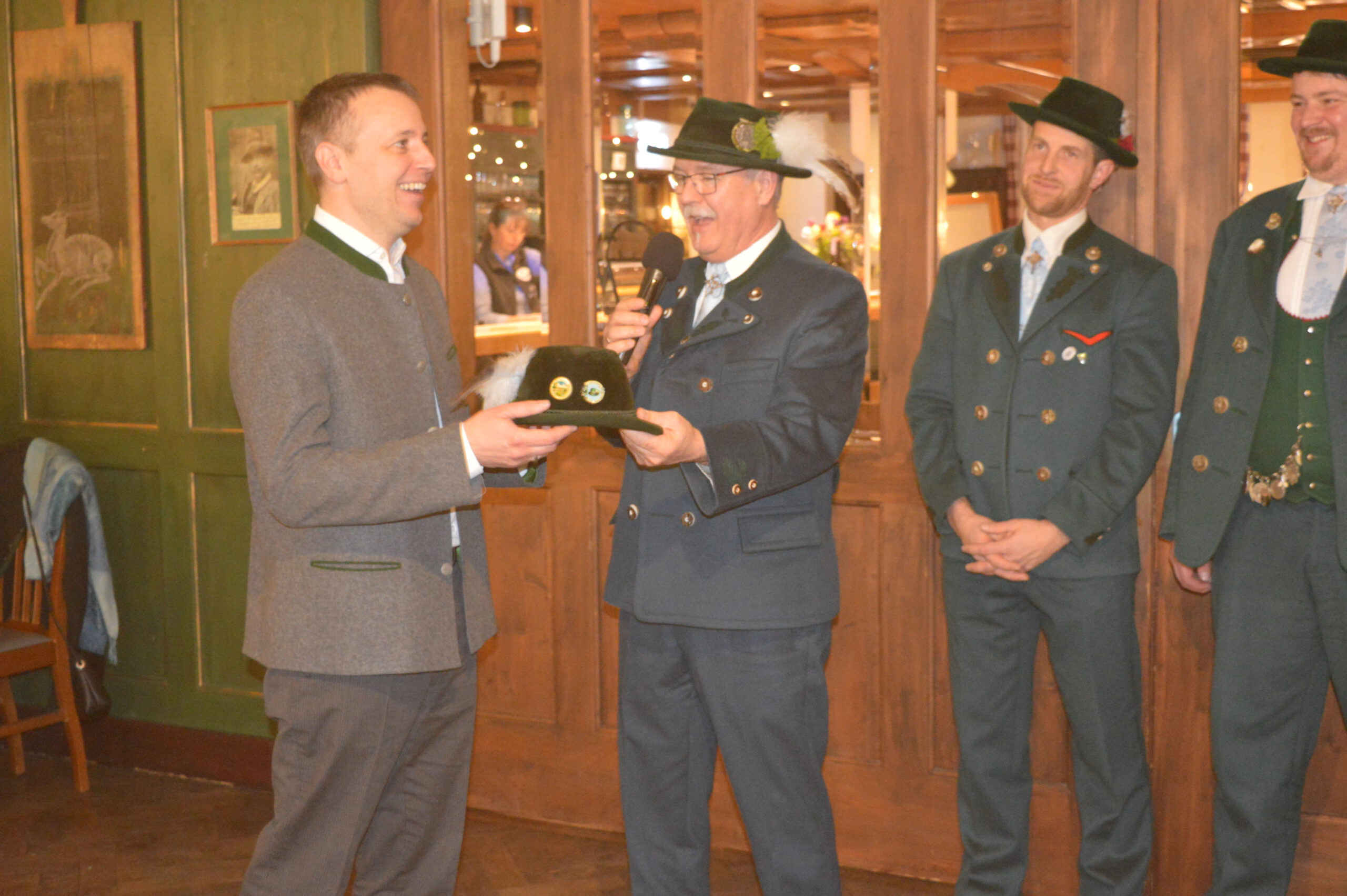 In Versform bat Festleiter Simon Schreiber (2. v. l.) den Oberbürgermeister Christian Hümmer (3. v. l.) zusammen mit dem dritten Bürgermeister Sepp Kaiser (3. v. r) und den Vorständen der Trachtenvereine „D´Giatlichn Hochbergler“ Julian Heigenhauser (l.), „Eschenwald Rettenbach“ Franz Maier (2. v. r.) sowie „Trauntaler Traunstein“ Hans Hölzle (r.) die Schirmherrschaft für das Gaufest 2025 in Traunstein zu übernehmen. Dieser nahm das Ehrenamt gerne an und zeigte sich zuversichtlich im Hinblick auf das gute Voranschreiten der Festvorbereitungen. Zum Dank dafür wurde ihm im Rahmen einer zünftigen Feier, welche von den aktiven Trachtlern aller drei Vereine gestaltet wurde, als Zeichen der Zugehörigkeit und Verbundenheit ein Traunsteiner Hut überreicht. Der Gauvorstand Michael Hauser bedankte sich zum Abschluss noch einmal ausdrücklich bei der Stadt Traunstein und den drei Vereinen, dass diese unter den gegebenen Umständen die Ausrichtung des 135. Gaufestes so kurzfristig und unkompliziert übernommen hätten. Gemütlich Klang der Abend mit guten Gesprächen in lockerer Atmosphäre aus.
