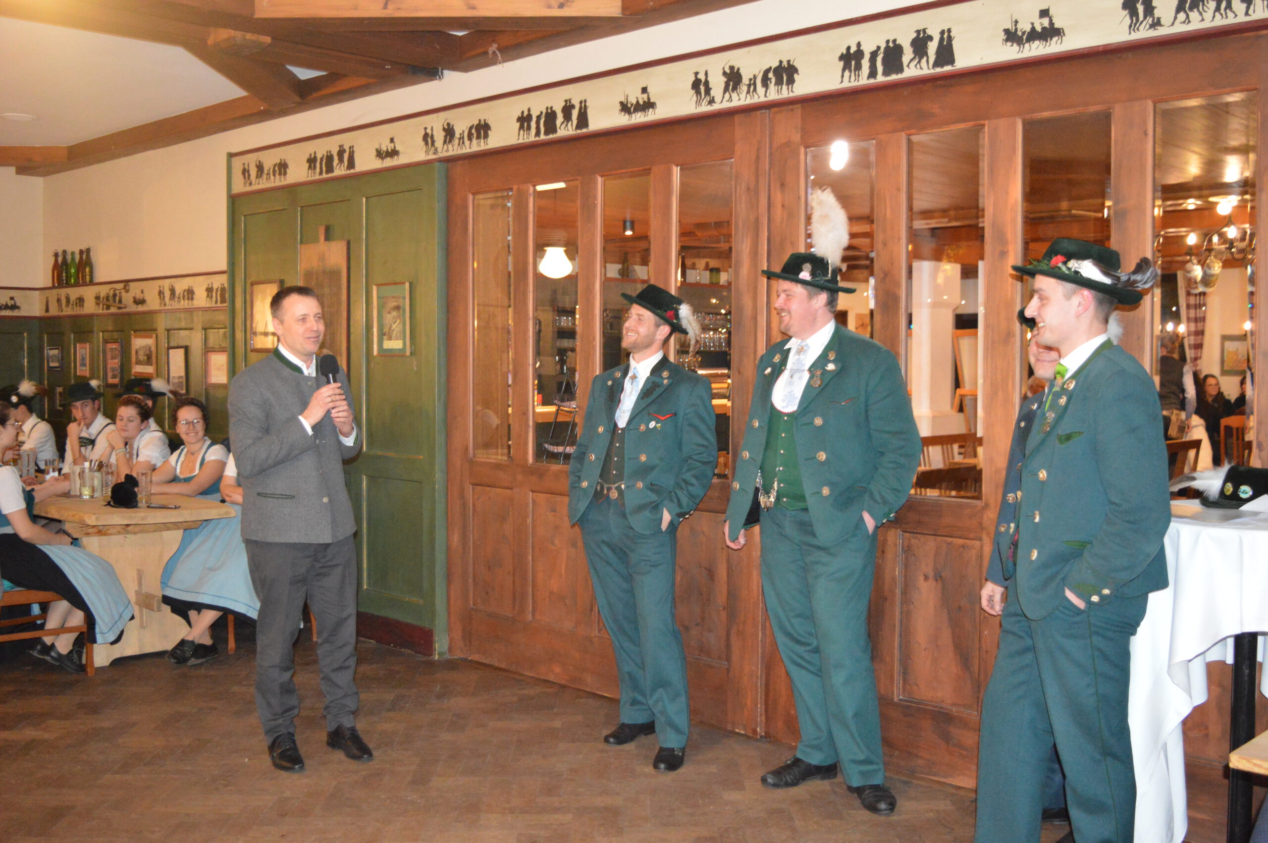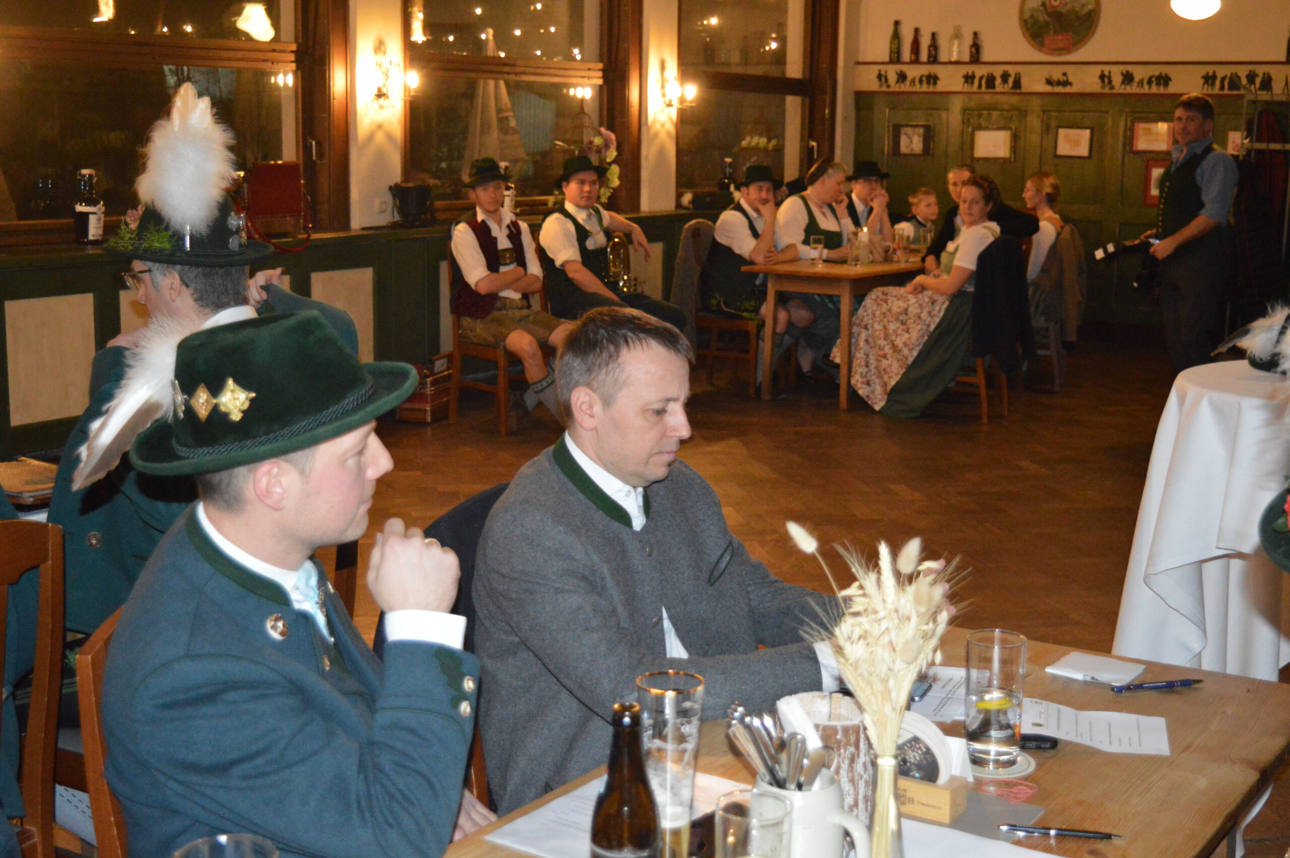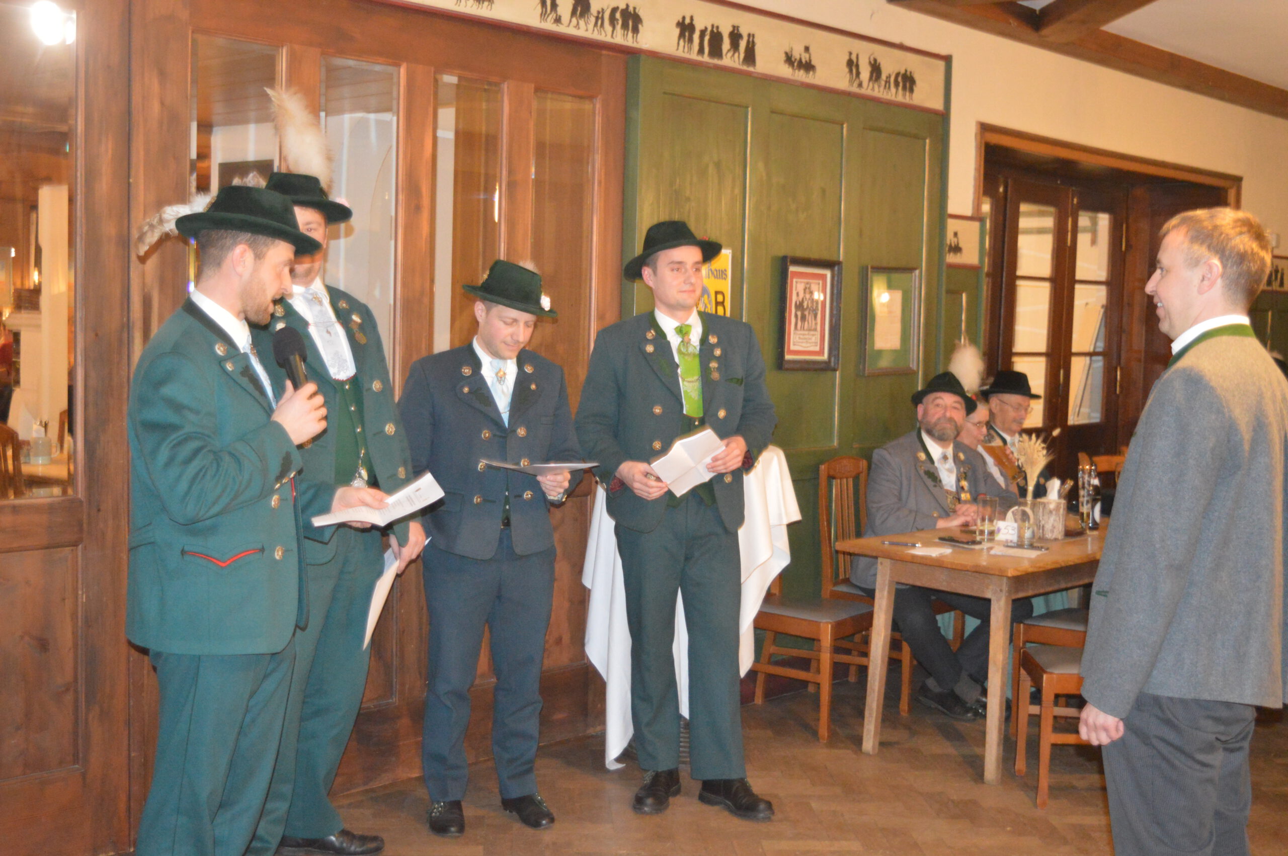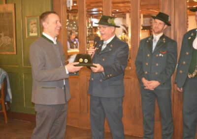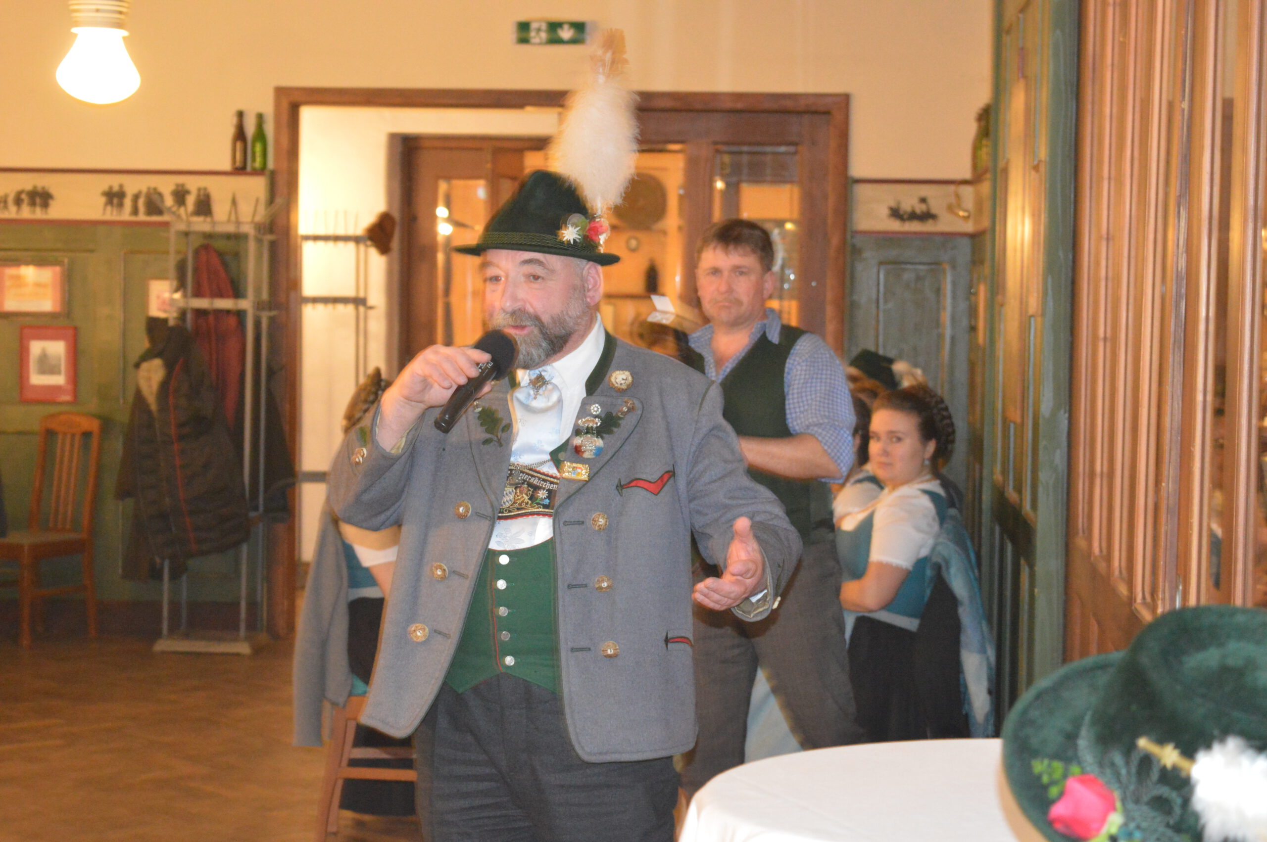 In Versform bat Festleiter Simon Schreiber (2. v. l.) den Oberbürgermeister Christian Hümmer (3. v. l.) zusammen mit dem dritten Bürgermeister Sepp Kaiser (3. v. r) und den Vorständen der Trachtenvereine „D´Giatlichn Hochbergler“ Julian Heigenhauser (l.), „Eschenwald Rettenbach“ Franz Maier (2. v. r.) sowie „Trauntaler Traunstein“ Hans Hölzle (r.) die Schirmherrschaft für das Gaufest 2025 in Traunstein zu übernehmen. Dieser nahm das Ehrenamt gerne an und zeigte sich zuversichtlich im Hinblick auf das gute Voranschreiten der Festvorbereitungen. Zum Dank dafür wurde ihm im Rahmen einer zünftigen Feier, welche von den aktiven Trachtlern aller drei Vereine gestaltet wurde, als Zeichen der Zugehörigkeit und Verbundenheit ein Traunsteiner Hut überreicht. Der Gauvorstand Michael Hauser bedankte sich zum Abschluss noch einmal ausdrücklich bei der Stadt Traunstein und den drei Vereinen, dass diese unter den gegebenen Umständen die Ausrichtung des 135. Gaufestes so kurzfristig und unkompliziert übernommen hätten. Gemütlich Klang der Abend mit guten Gesprächen in lockerer Atmosphäre aus.